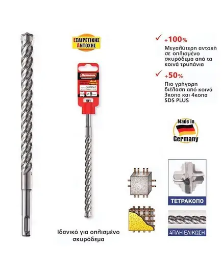 +100% μεγαλύτερη αντοχή από τα κοινά τρυπάνια σε οπλισμένο σκυρόδεμα.