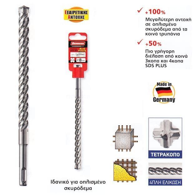 +50% πιο γρήγορη διέλαση σε σχέση με τα τρίκοπα και τετράκοπα τρυπάνια sds plus.