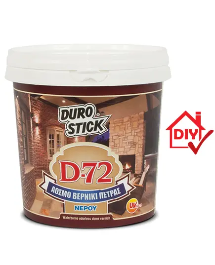ΙΔΙΟΤΗΤΕΣ Ακρυλικό, διάφανο βερνίκι εμποτισμού πέτρας, υδατικής βάσης. Παραμένει διάφανο, χωρίς να κιτρινίζει ή να ξεφλουδίζει. Αναδεικνύει τα φυσικά ‘νερά’ της πέτρας και δίνει στην επιφάνεια την αίσθηση του ‘μόνιμα βρεγμένου’. Το βερνίκι DUROSTICK D-72 προστατεύει τους αρμούς των πλακόστρωτων δαπέδων από τη ρηγμάτωση, την αποσάθρωση και τους ρύπους. Άοσμο, υδατοδιαλυτό, φιλικό στον άνθρωπο και το περιβάλλον.
